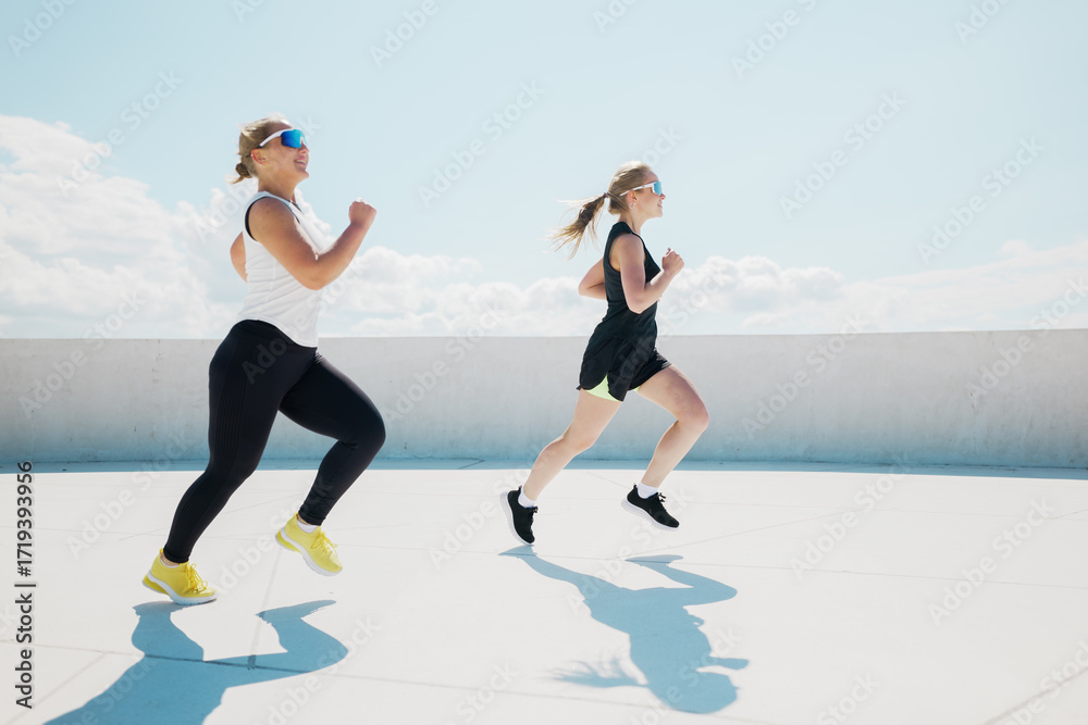 Enthusiastic women jogging on a sunny rooftop during a fitness session