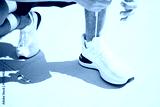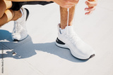 Man tying shoelaces on white athletic sneakers outdoors in sunny weather