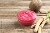 Tasty horseradish sauce with beetroot, roots and vegetable on wooden table, closeup. Space for text