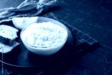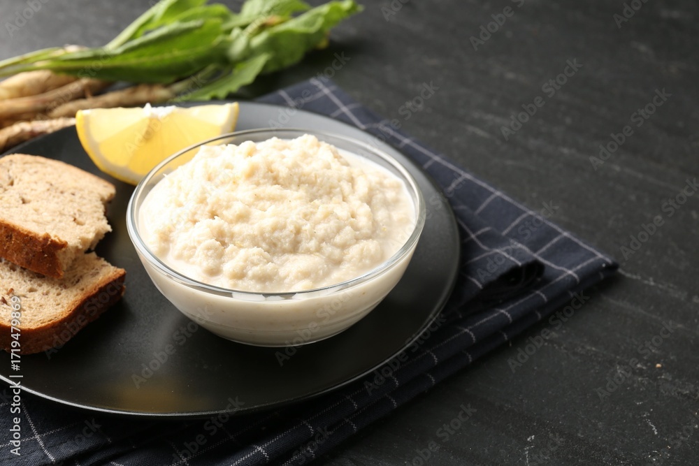 Tasty horseradish sauce served on black table, closeup. Space for text