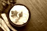 Tasty horseradish sauce with parsley and roots on black table, flat lay. Space for text