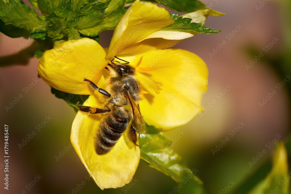 Westliche Honigbiene (Apis mellifera) sammelt Pollen an der gelben Blüte einer Großblättrigen Damiana (Turnera ulmifolia) - Fataga, Gran Canaria, Kanarische Inseln