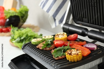 Electric grill with tasty meat and vegetables on white table in kitchen, closeup