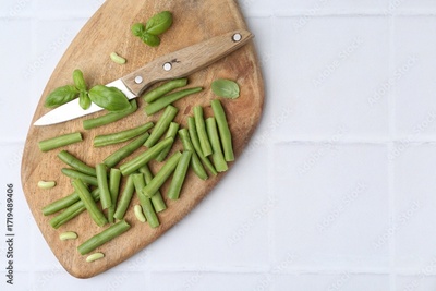 Cut green bean pods, basil and knife on white tiled table, top view. Space for text