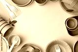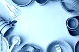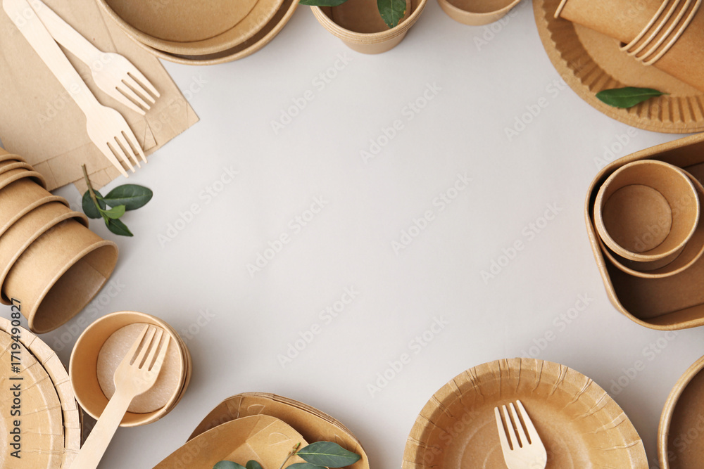 Set of disposable tableware and green leaves on white background, flat lay. Space for text