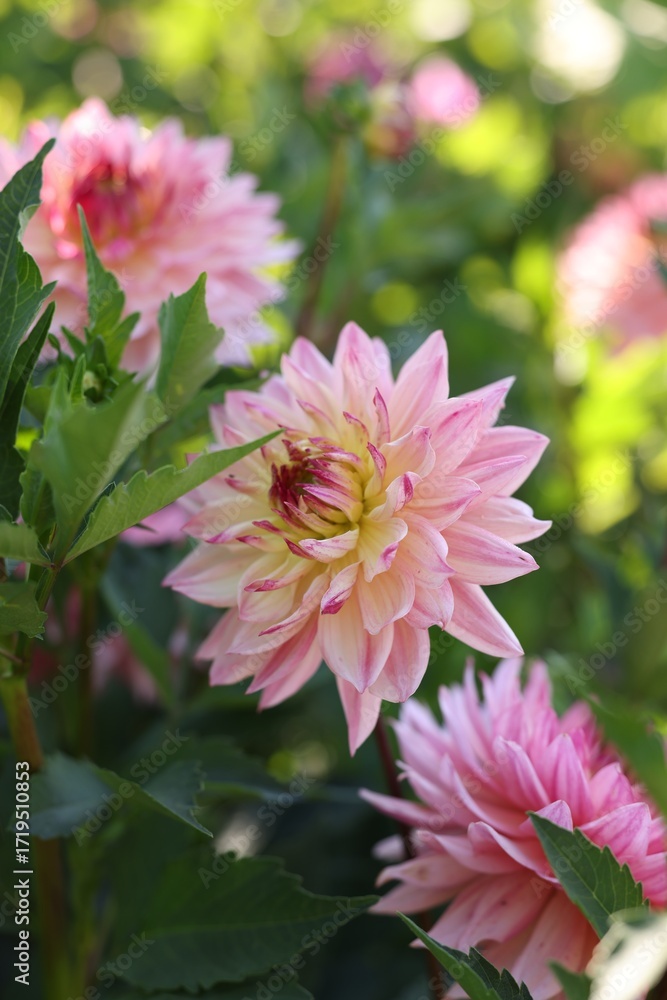 Beautiful pink dahlia flowers with green leaves growing outdoors