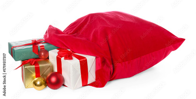 Santa Claus bag with Christmas gifts and bright baubles isolated on white