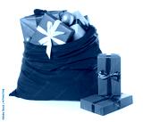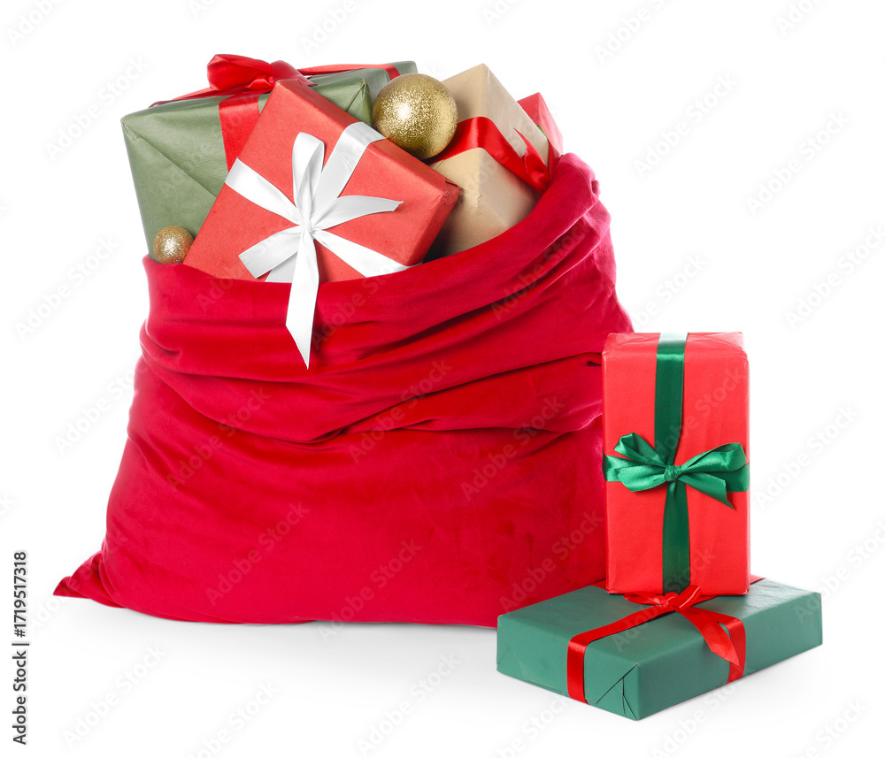Santa Claus bag with Christmas gifts and bright baubles isolated on white