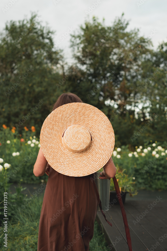 Woman with straw hat walking away from dahlia garden towards lush greenery