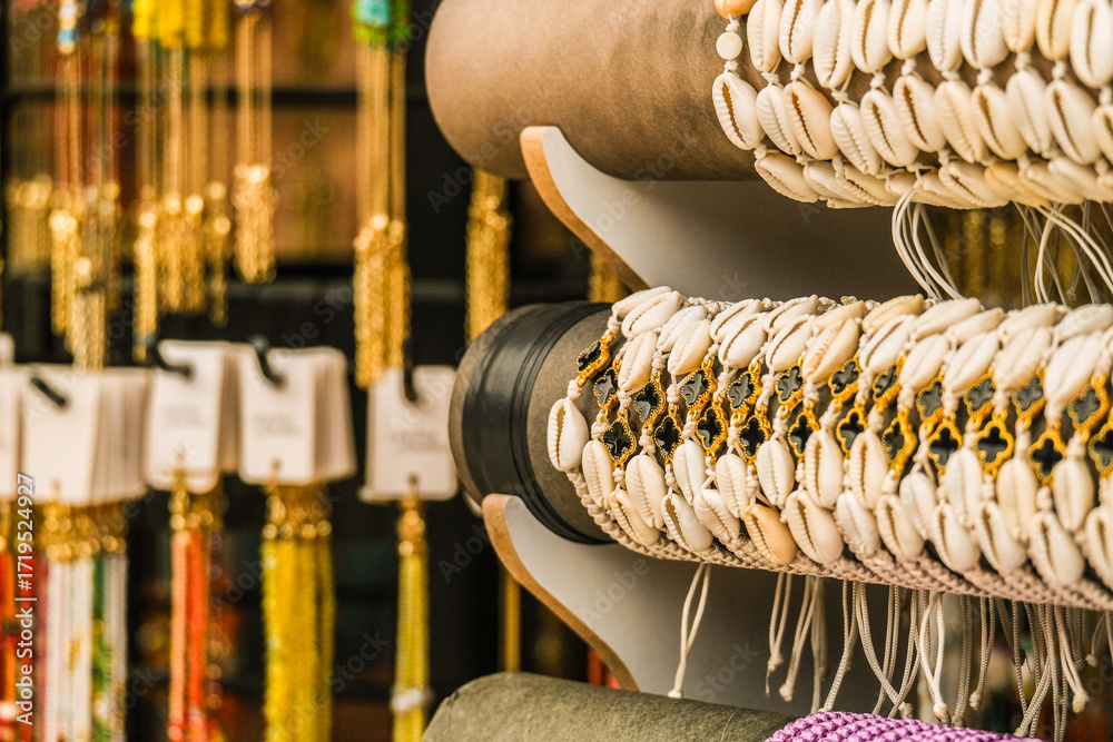 Close up of shell bracelets and gold jewelry at a market stall. Travel souvenirs and artisanal crafts for sale.