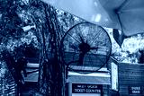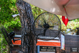 Outdoor misting fan and security camera attached to a tree next to a ticket counter in Turkey, cooling system.
