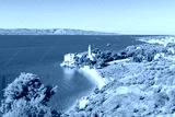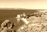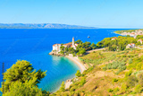 View of beautiful bay with beach and Dominican monastery in Bol town, Brac island, Croatia