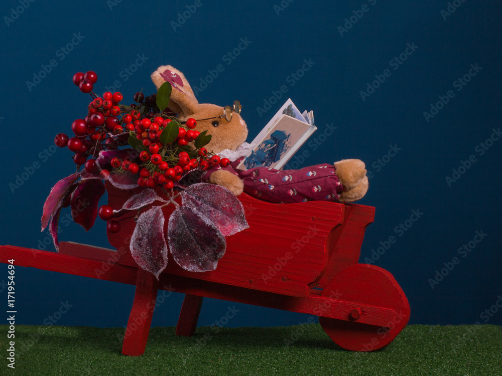 The hare lies in a red cart and reads a book. Autumn concept