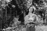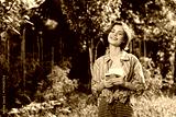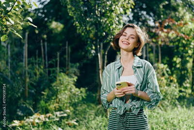 Cheerful young woman standing in a sunny garden, holding a smartphone with a bright smile, wearing a green striped shirt and casual dress.