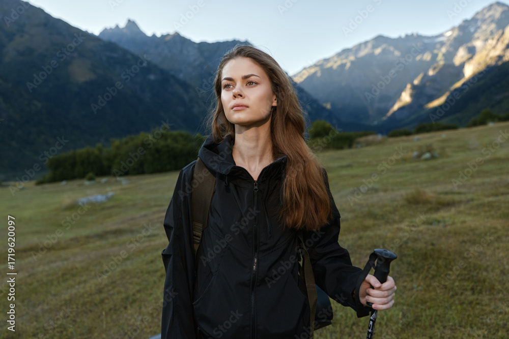A thoughtful young hiker stands in a rugged mountain landscape, gripping a trekking pole and gazing into the distance, exuding adventure, focus, and determination in a pristine alpine setting.