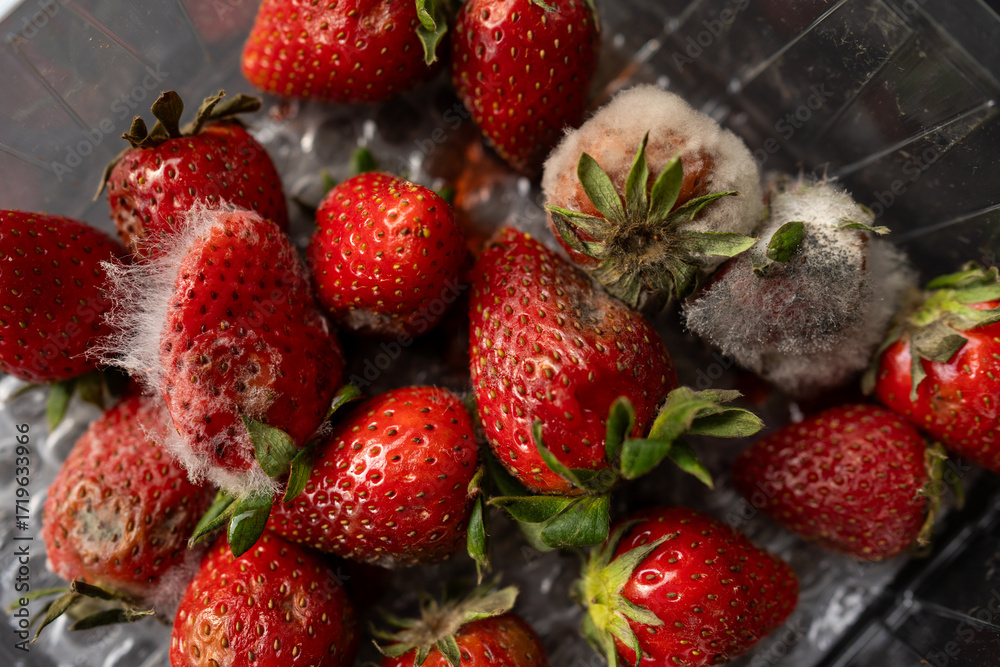 Close-up of strawberries covered with visible mold inside a plastic container, symbolizing spoilage, contamination, and unhealthy food.