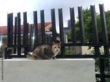 Cat sitting on a wall in a residential area