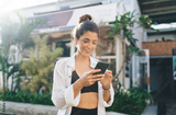 Woman standing, smiling at her phone in sunlight—showcases mobile empowerment, digital connection, and confidence in everyday tech interaction.
