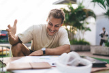 Freelancer enthusiastically reacts during brainstorming, embodying creative communication, tech flexibility and energy of digital project discussions in remote conditions.