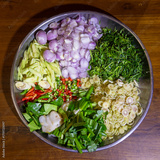 Bowl filled with variety of fresh, colorful chopped vegetables and herbs, including shallots, lemongrass, and chili peppers