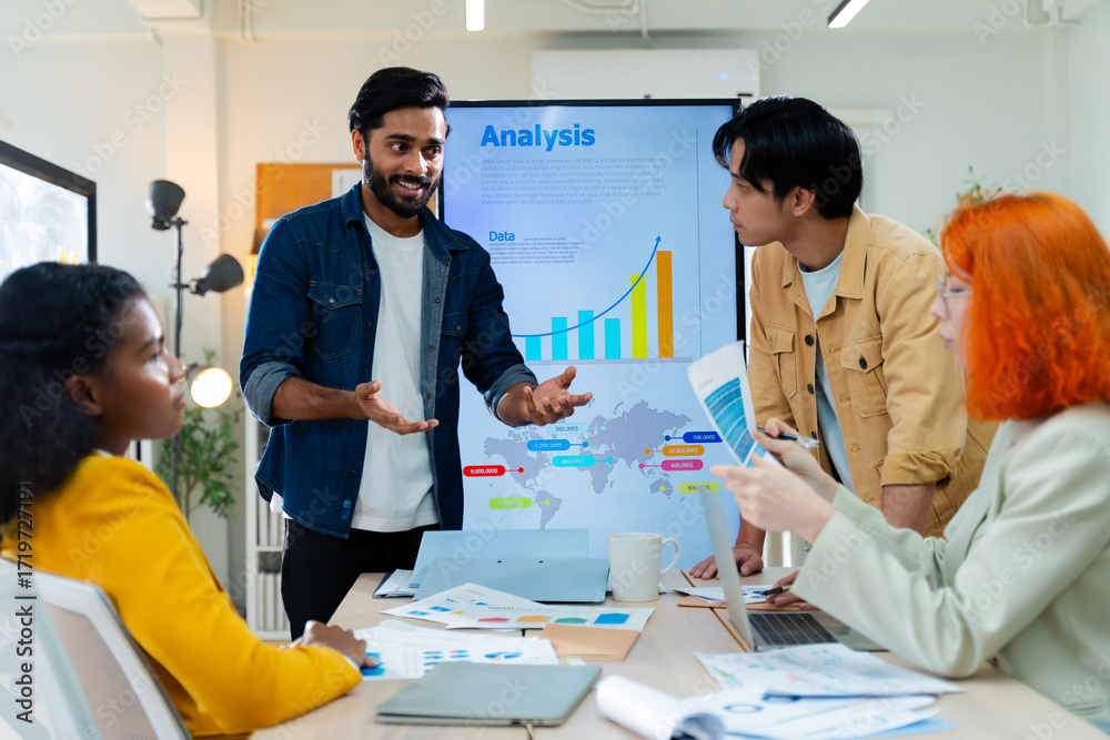 Group of young creative business brain storm meeting presentation,discussing roadmap to product launch, planning,strategy,new business development,working with new startup project in office.