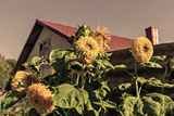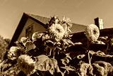 Beautiful yellow sunflowers against background of private house. Sunflowers with bright yellow petals are blooming in lush garden, showcasing their vibrant colors against rustic house backdrop