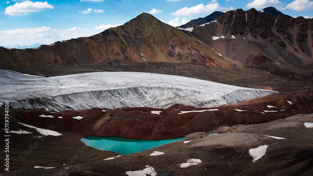 Aerial drone view of the grey ice tongue of the Lenin Glacier, red and brown mountains and a bright turquoise moraine lake beneath multicolored ridges