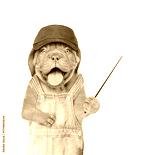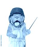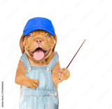 Happy Mastiff puppy wearing blue cap and denim overalls pointing away on empty space. Isolated on white background