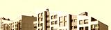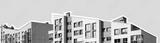 Modern residential building in minimalist style with geometric roof lines, black and white facade,