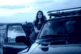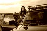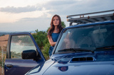 Woman standing by a blue SUV at sunset in the countryside, evoking freedom, travel, and adventure on the open road