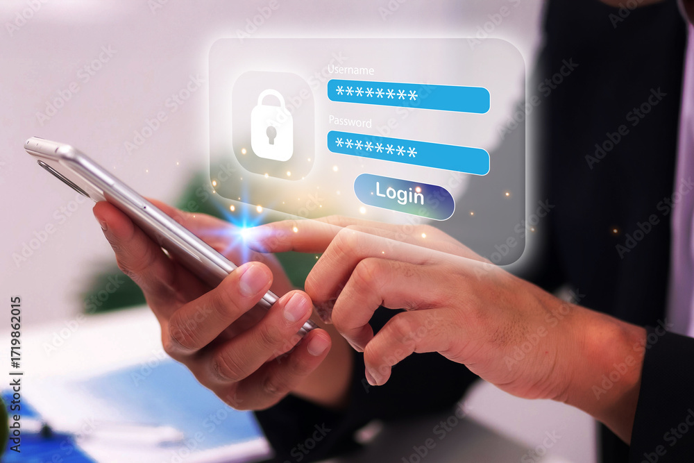 Adult hands operate smartphone to securely log into online application entering username password access digital services ensuring data privacy and cyber protection