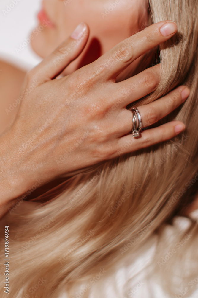 Close up of woman's hand with diamond engagement ring, fashion and accessories concept
