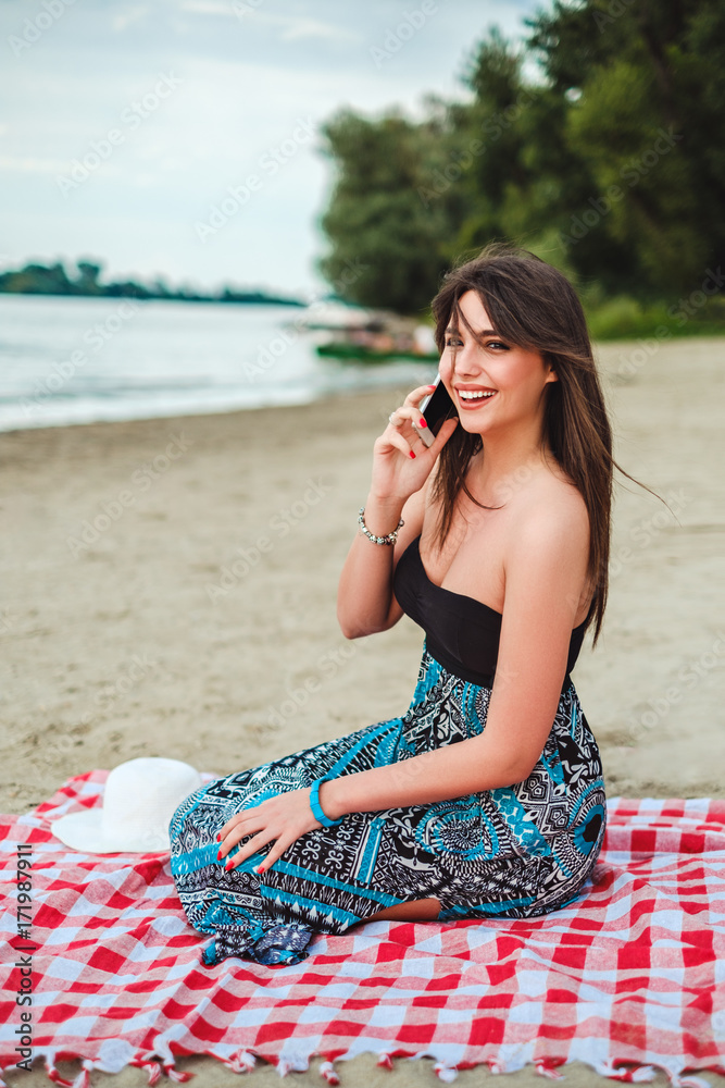 Smiling girl sitting at the beach and talking on the phone