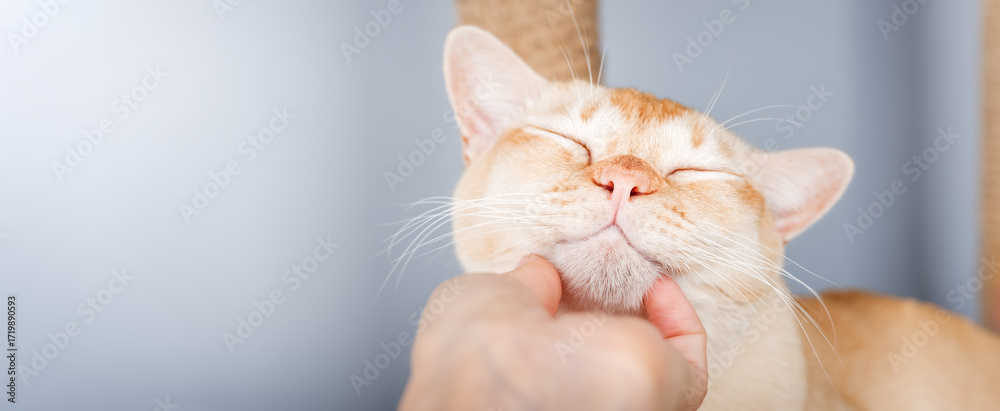 A womans hand gently scratches under the chin of a cream-colored Burmese cat.