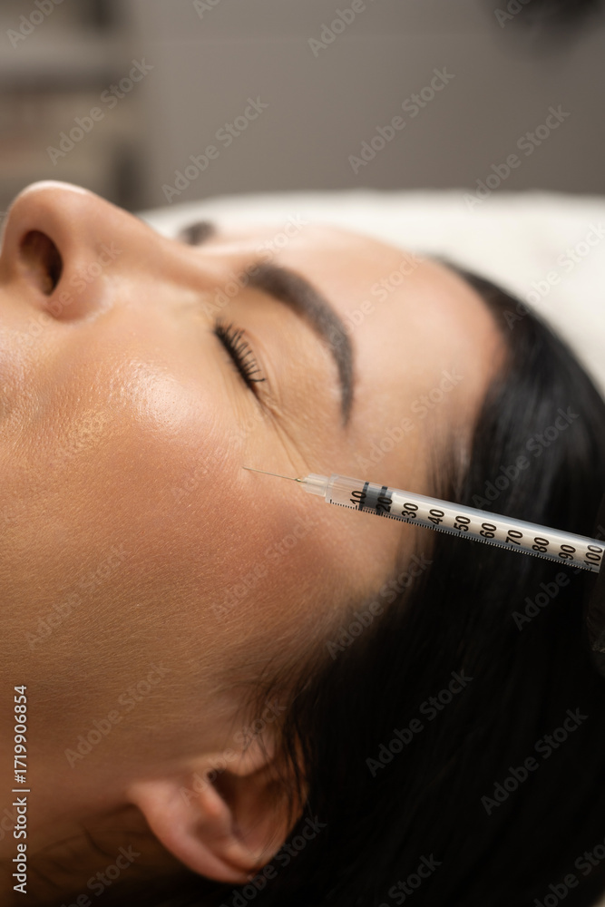 Close-up of a woman receiving a cosmetic injection near the eye area. A syringe is applied to the skin for beauty treatment, anti-aging care, and wrinkle reduction, symbolizing modern aesthetics and