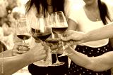 Group of friends clinking glasses with red and rosé wine outdoors, festive atmosphere of winery visit, grape harvest holiday, celebration and summer leisure.