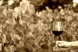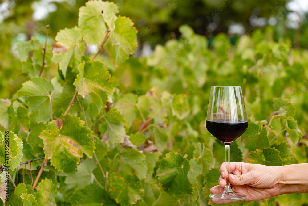 Close-up of a hand placing a glass of red wine on dry soil in a vineyard. Concept of winery, harvest season, winemaking, holiday, and tasting experience.