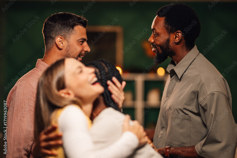 Friends embracing and laughing together at home