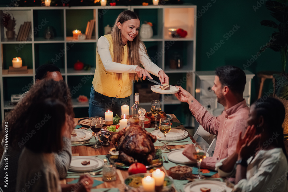 Woman serving slice of pie to friend at thanksgiving dinner table