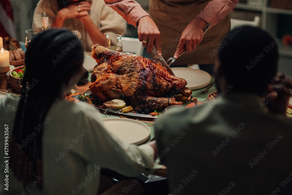 Family celebrating thanksgiving, carving roasted turkey at home dinner table