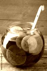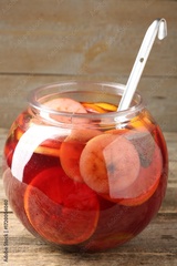 Tasty fruity punch on wooden table, closeup. Refreshing drink