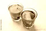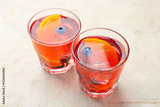 Tasty fruity punch in glasses on light gray textured table, closeup