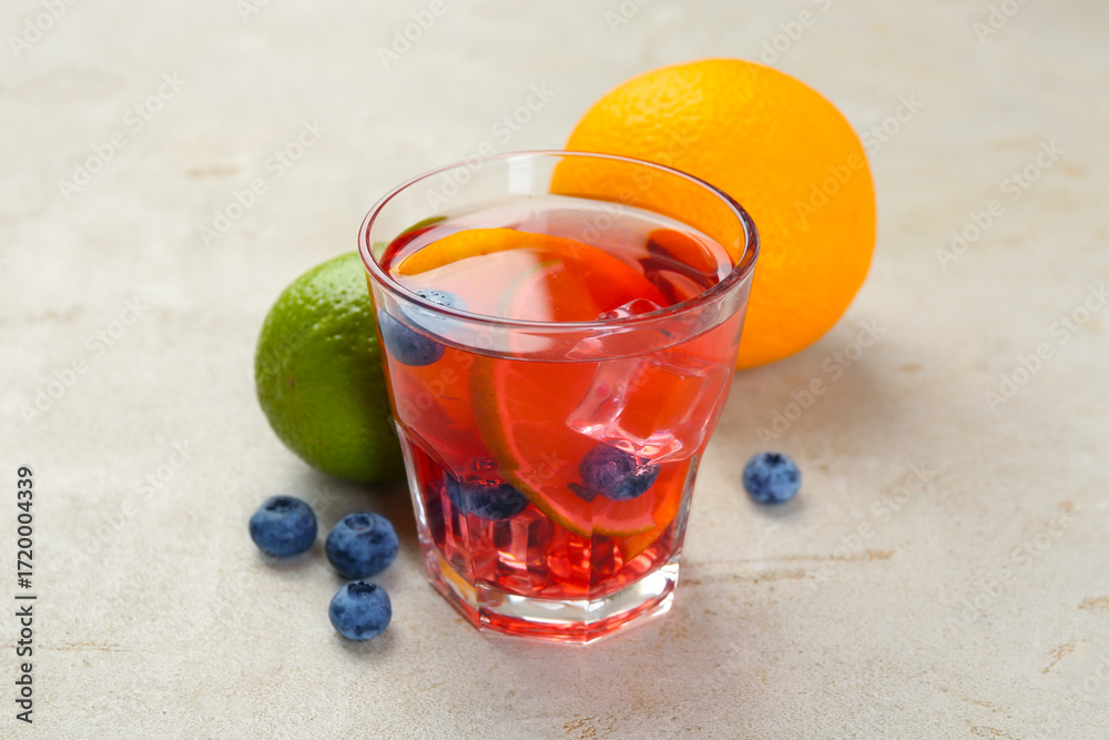 Tasty punch, fruits and berries on light gray textured table, closeup
