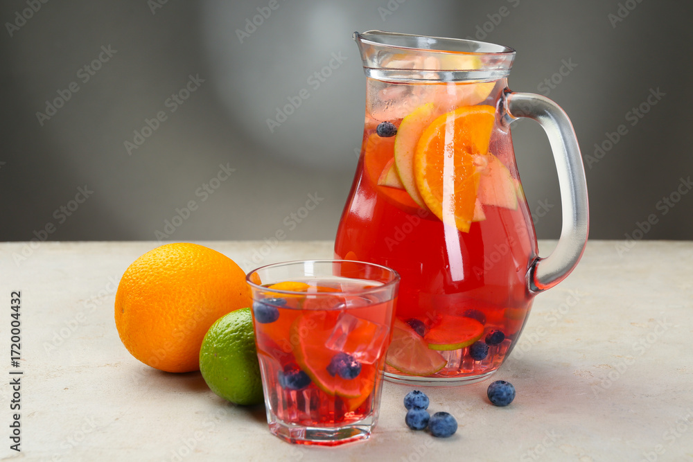 Tasty punch, fruits and berries on light gray table