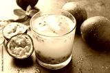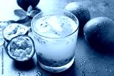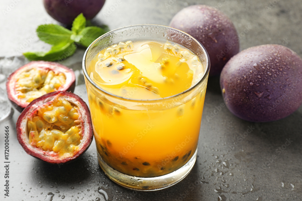 Tasty passion fruit drink with mint and fresh fruits on grey table, closeup