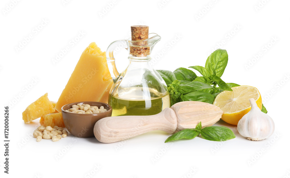 Fresh ingredients for pesto sauce and squeezer isolated on white