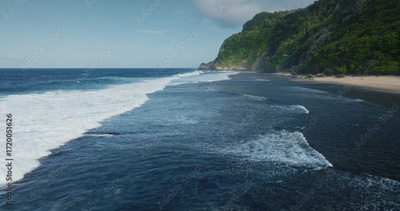 Ocean waves crashing on Nyang Nyang black sand beach, Bali, lush green cliffs in background, creating breathtaking tropical paradise scene. Stunning aerial view of beautiful nature, travel background