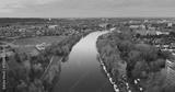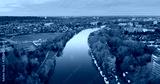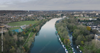 London city , Teddington: River Thames winding through Teddington, showcasing moored boats, residential houses, and green spaces on a cloudy day. UK capital cityscape. Aerial view drone flight