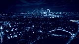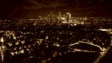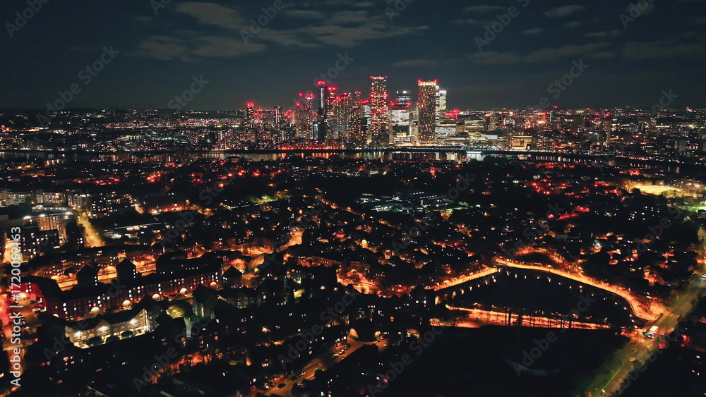 England, London: Illuminated skyscrapers of Canary Wharf dominate the London skyline at night from an aerial view, contrasting with the warm glow of nearby residential lights. Zoom out panorama