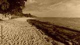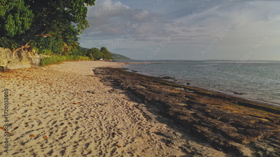 Golden sand beach meeting volcanic rocks extends into calm ocean water under cloudy sky at sunset on tropical Tahiti island in French Polynesia